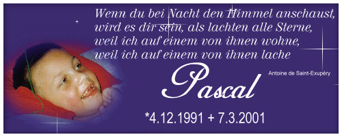 Es ging Pascal immer schlechter und am 7. März 2001 mussten wir ihn dann gehen lassen. Es schmerzt immer noch......obwohl manche denken werden, es ist schon 12 Jahre her.
