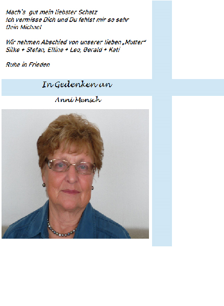 87 Jahre Anna Margareta Mensch (geb. Neuhaus)