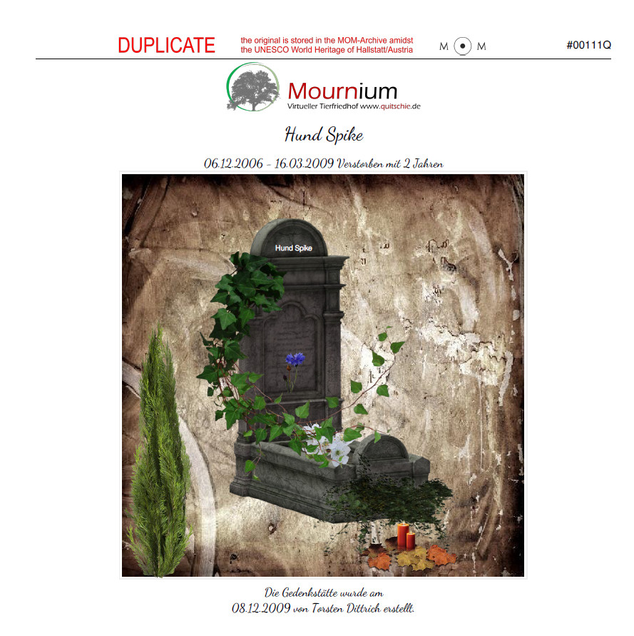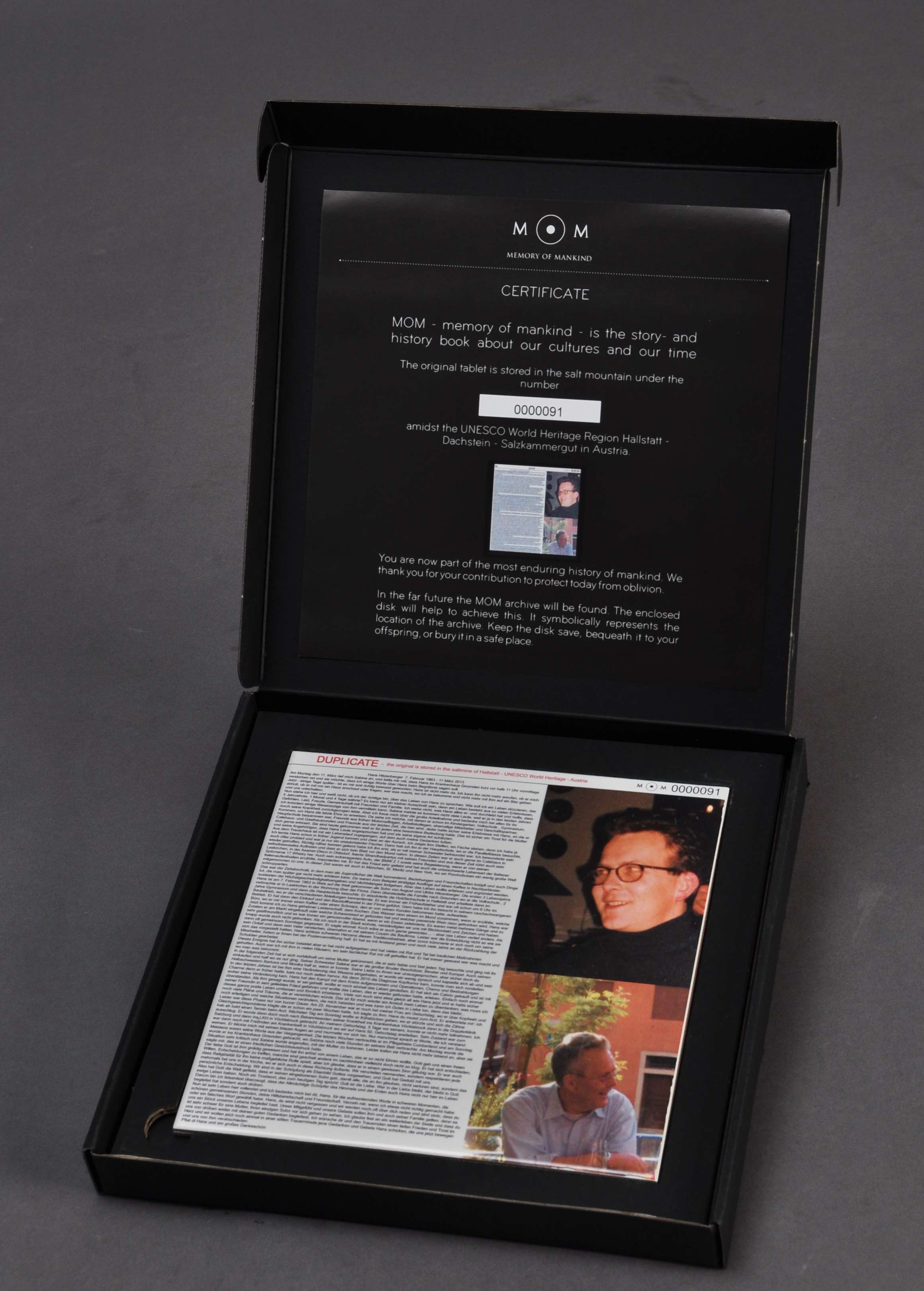 Memory of Mankind - MOM - bewahrt die Geschichten unserer Zeit vor dem Vergessen. Erzählen Sie in Wort und Bild die ganz persönliche Geschichte der Person, der Sie auf Soulium oder Mournium ein virtuelles Grab gewidmet haben oder laden Sie ein eigenes Bild hoch. Geschützt, tief in einem Berg, und haltbar auf keramischen Datenträgern erzählt MOM unsere Geschichten für 1.000.000 Jahre. Werden Sie Teil dieser Geschichte und erstellen Sie eine Tontafel Ihrer Gedenkstaette eines Ihnen geliebten Menschen oder Tieres. Diese Tontafel wird in einem stillgelegten Salzstock eingelagert und so zukünftigen Generationen, Kulturen oder sogar Zivilisationen erhalten bleiben.Zusaetzlich erhalten Sie ein Duplikat, sowie ein Zertifikat für Zuhause.